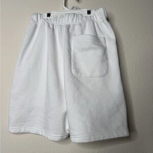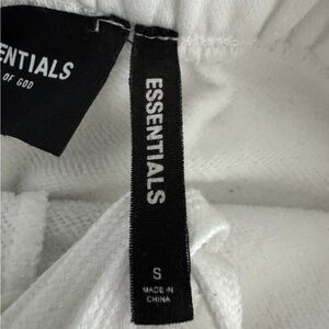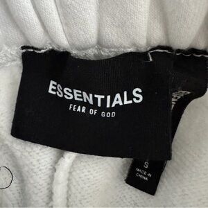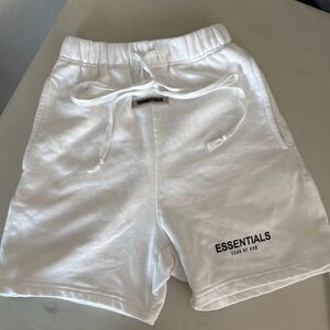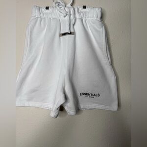 Fear of God Essentials shorts. Crisp white design. Comfortable fit for athletic wear.