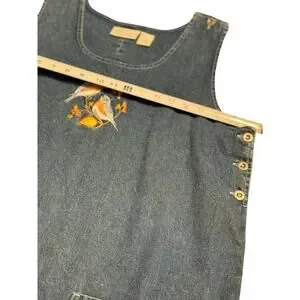 Charming and nature-inspired vintage denim jumper dress by National Wildlife Federation. Features sweet embroidered birds on the chest and functional button details down each side. Made from soft, sturdy 100% cotton denim with two large front pockets. Perfect for layering over tees in summer or turtlenecks in cooler months. Rare vintage piece with timeless cottagecore appeal.