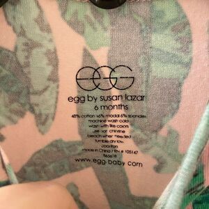 Egg by Susan Lazar Girls Pink Green Leaves Footed Zipper Sleeper Size 6 Months. Hidden zipper. The zipper is a neon pink color and does have some paint chipped off. EGG is written in neon pink on the bottom of the sleeper and does have some cracks in the writing. Have been worn and washed, so there is wash wear and fade, but still so cute and still have a ton of life left. Good Used Condition.