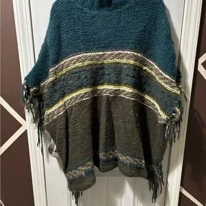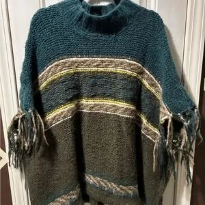 Chic knit poncho with fringe details. Features teal, brown, and yellow stripes. Perfect for layering.