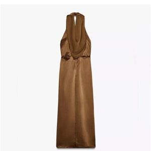 Zara SATIN EFFECT HALTER MIDI DRESS M Brown NWT