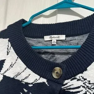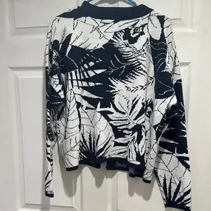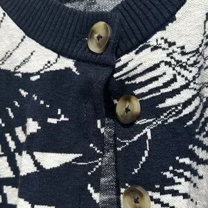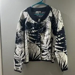 Stylish navy and white sweater. Features bold leaf pattern. Button-up front. Perfect for layering.