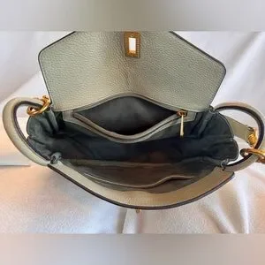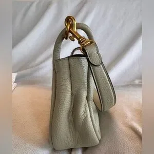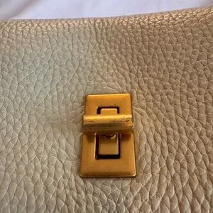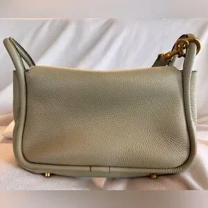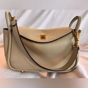 Discover elegance with this chic leather shoulder bag and brushed gold hardware. Perfect for elevating any outfit with its sophisticated design. Dust bag included. No rips or stains. Slight signs of wear on toggle; see picture.