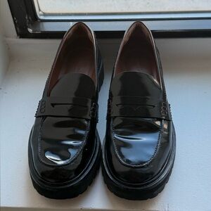 A platform loafer with a chunky leather lug sole, penny loafer details, and moc-stitching.