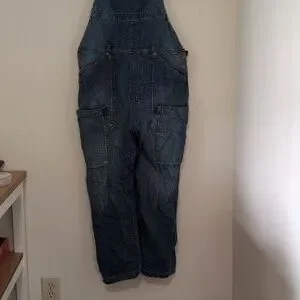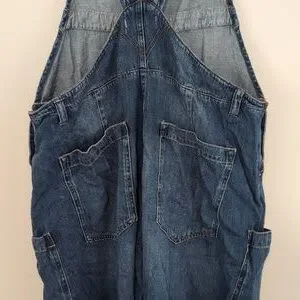 Dark blue denim overalls with a relaxed oversized fit.
