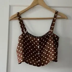 Stylish brown polka dot cropped tank top perfect for any occasion. My closet also features the matching skirt if you’re interested!