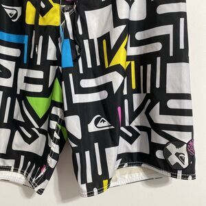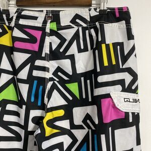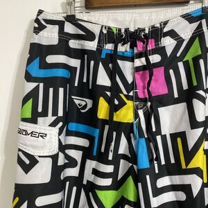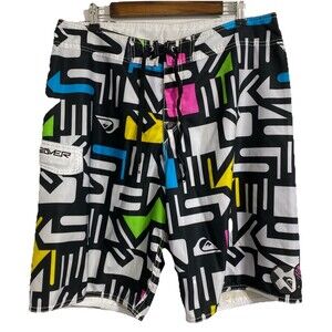 Quicksilver Board Shorts Men's Waist 36 Swim Trunks Cargo Pocket Unlined 90s Y2K Surfwear Performance Sports Coastal Beach Ocean Pool Vacation Cruise Resort Spring Break Casual Comfort Surfing Swimming Saved By The Bell Show Pattern Colorway Vibes. Pre-owned, very gently used with no flaws and tons of life left! Please see all pictures and read the measurements. Black, white, pink, blue, green and yellow in color. Hook and loop fly closure with drawstring.