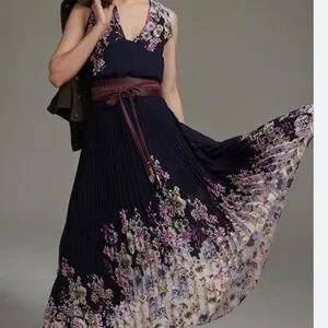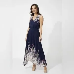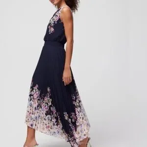 Beautiful elegant navy blue floral dress that is sleeveless and a hi-lo maxi. A cinched waist and pleated bottom.