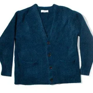 The Mohair Cardigan is soft, boxy oversized v-neck silhouette made from a mohair-wool blend.
