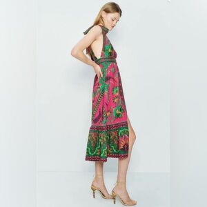 Embrace the vibrancy of the Ana Tapestry Pink Midi Dress, featuring a delightful plunge neckline and an expressive tapestry of florals in hues of pink and green. The cinched waist gives way to a fluid skirt that dances just below the knee, while delicate ties grace the shoulders, adding a touch of whimsical charm. This dress is a unique embodiment of joyful elegance, perfect for those who adore a splash of color and intricate design in their wardrobe.