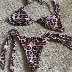 Stylish leopard print bikini set. Features a halter top and tie-side bottoms.