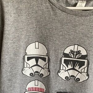 Men’s gray Star Wars Clone Trooper tshirt. Features Clone Trooper helmets in vibrant colors. Soft and comfortable for daily wear. Has minimal wear and tear on clone trooper helmet logos, otherwise in good condition (shown in pics). Size large. Brand is Disney. Purchased at Disney World. Great for Star Wars fans! :)