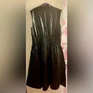 Your ticket to around-the-clock compliments. Crafted from faux leather, the Tommie Dress begins with captivating cap sleeves and a plunging v-neckline, accented by an elongating zip-front detail and punctuated with a swingy midi skirt.