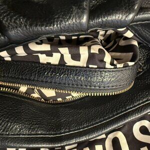Soft, slouchy Marc by Marc Jacobs hobo in black pebbled leather with rolled top handle, detachable shoulder/crossbody strap, and gold-tone hardware. Interior features the signature jumbled logo lining and zip pocket—casual, durable, and perfect for everyday carry.