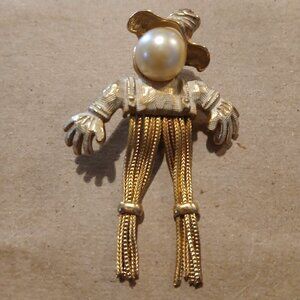 Vintage Harvesy Scarecrow Goldtone Faux Pearl Dangle Legs Brooch