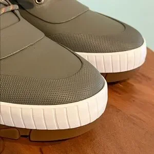 Beautiful green in color with white / cream trim ending with a gum sole. Neoprene shaft for easy on/off and comfort.
