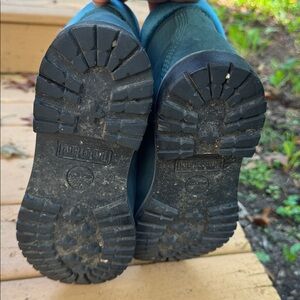 Teal boots with black soles. Features Timberland logo on the side. Velvet uppers and velvet laces. Gently worn; soles have some dirt but otherwise are in great shape. Velvet has a small scratch in it on the back of the left boot. Otherwise the laces are in great condition and these have lots of life left.