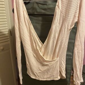 Chic wrap blouse with a deep V-neck. Soft ribbed texture. Long sleeves for versatile styling.
