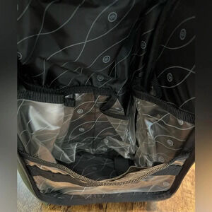 Everything Bag, for travel. Full zip around closure. The interior flap has 2- zippered pockets & 1- mirror. The inside of the bag has 1- mesh, zippered pocket, 4- slide in pickets, 2- elastic straps to slide products and an open space. The back has a shallow storage space with full zipper closure. This is a sturdy travel bag. Everything Bag metal logo plate on the front. Well made. Brand new bag. NWOT. Never used.