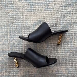 Elegant black mules with a striking gold heel. Open-toe design. Perfect for a chic look.