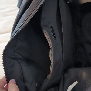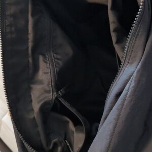 Sleek black tote by Lululemon. Durable nylon material. Ideal for daily use. 13.5 in laptop divider, with zipper. Large inner zipper pocket. 4 outer pockets. Adjustable strap, missing one carabeaner attachment. Some signs of wear. I'll be washing this and taking a video of it all, so if you're interested, leave a comment and I'll let you know when I update the post.