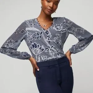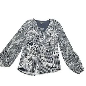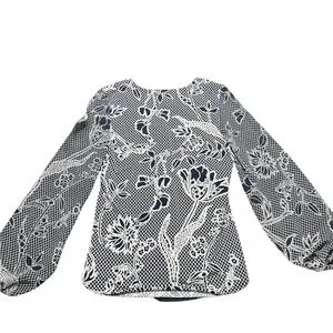 Chic floral blouse with long sleeves. Features intricate patterns. Ideal for versatile styling.