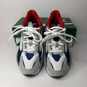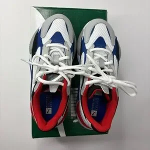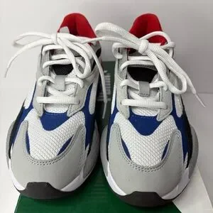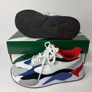 Vibrant Puma sneakers for kids. Red, blue, and gray design. Ideal for active play.