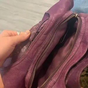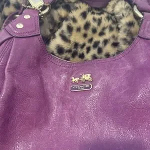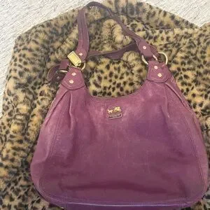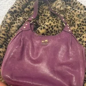 Chic plum leather bag by Coach. Features gold-tone accents. Ideal for versatile styling.