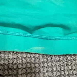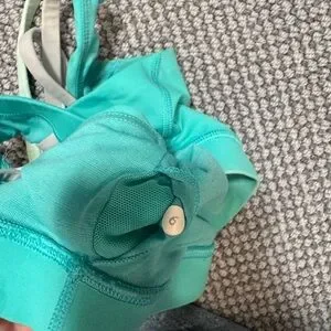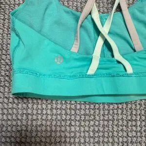 lululemon energy bra in decent condition size 6. There are two bleach stains — one is on the inside and one is outside. The stitching in the back has also unraveled a bit. Please see photos