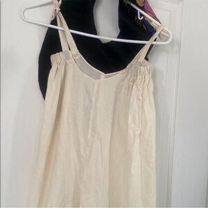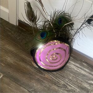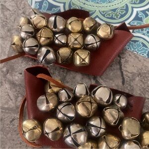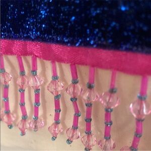 Vibrant blue fabric with gold sequin embellishments. Features pink and white accents. I believe she handmade it all. Leather ties and bells for braids