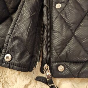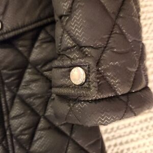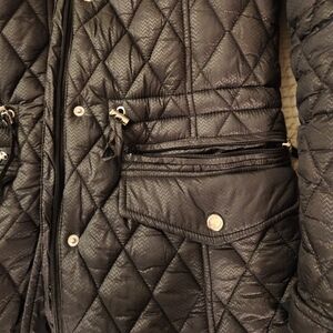 Quilted puffer coat with cozy cream interior. Features a hood and both zip and snap closures. Ideal for cold weather. drawstring at waist.