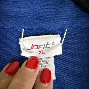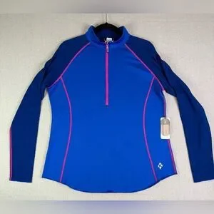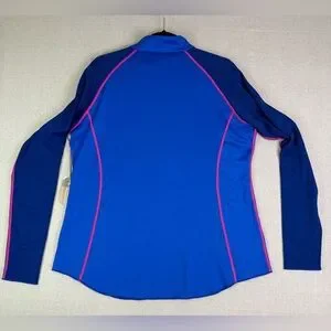 Chic blue top with pink accents. Long sleeves and half-zip design. Ideal for casual wear.