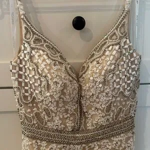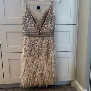 Chic mini dress with intricate beadwork. Features elegant feathered hem. Ideal for glamorous events. Was going to use it as a wedding reception dress but ended up finding something else! Never worn. In perfect condition. Super pretty dress 😍