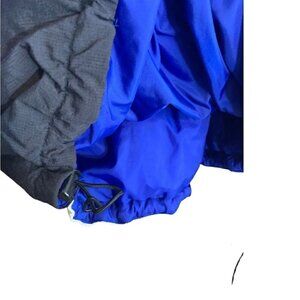 Columbia Blue, Back & White Puffer, Insulated Coat Jacket Size L Large Nylon. Hooded. Two outside pockets, one center flap pocket. Drawstring waist. Mesh pocket on the sleeve. Pull over with half zip closure. Excellent preowned condition with no known flaws, tears or stains.