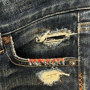 Trendy distressed denim. Perfect for casual outings. Never worn. 7.5” front rise 28” inseam with rolled cuff.