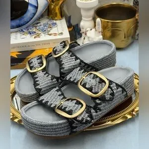 Loeffler Randall's 'Theo' slides rest on tall platforms that make a cool counterpoint to whatever you're styling them with. They're woven from raffia, and finished with buckles sized to balance the chunky proportions.