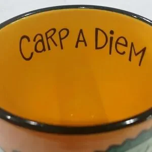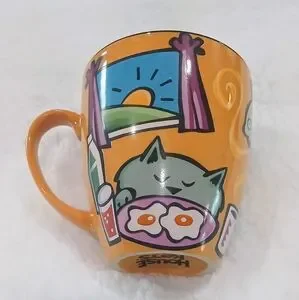 "House Kats" Collectible Coffee Mug. Whimsical design:cat,sunrise scene,fish,egg