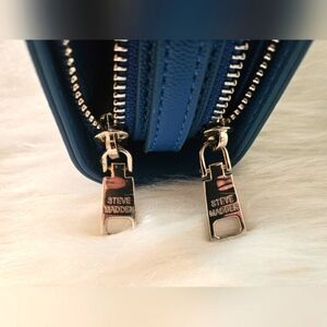 This vibrant cerulean blue Steve Madden crossbody bag is a stylish throwback with modern functionality. The smooth blue logo takes center stage on the front, adding a bold signature touch. Thoughtfully designed with two compartments, dual zippers, two interior zippered pockets, six card slots, and three storage sleeves, it keeps essentials neatly organized. The adjustable crossbody strap ensures a perfect fit, while the sleek logo-lined interior adds a refined finish. Only found flaw are small spots on the inner lining of one of the zippered pockets. Photo provided, price adjusted. Dimensions: Length: 7.25" Width: 2" Height: 5"