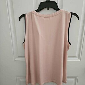 The Calvin Klein blush with black pipping sleeveless blouse features a stylish split neckline and a flattering V-neckline, size Large. This top can be dressed up or down - a great choice for any outfit or occasion.
