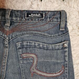 Unleash your inner fashionista with these Rock & Republic flared jeans, brand new, and never worn. Featuring a flattering vintage wash and a sleek flared silhouette, they bring a perfect blend of retro-inspired charm and modern sophistication. Crafted with attention to detail and premium materials, these jeans are ideal for creating effortlessly stylish outfits that turn heads wherever you go. A must-have for anyone who loves timeless, versatile denim with a bold edge. Measurements taken laying flat with a measuring tape: Waist: 28" Inseam: 34" Length: 41"