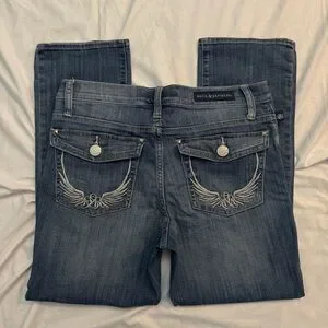 Dark wash low rise bootcut jeans with embroidered wings on pockets by Rock and Republic