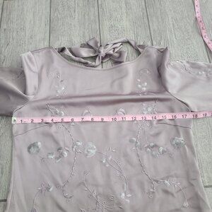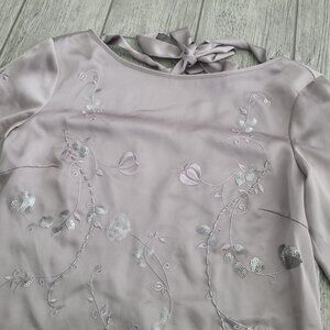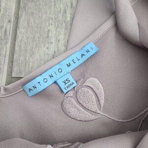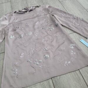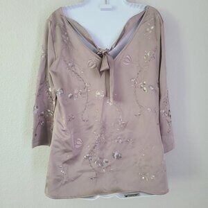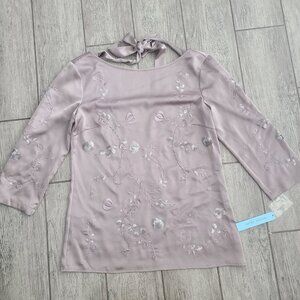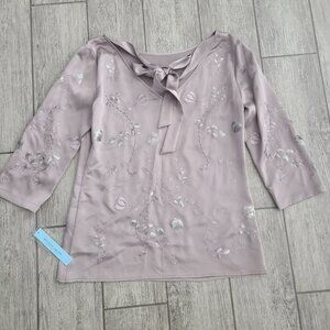 Elegant Antonio Melani blouse in a soft mauve shade called Romantic Opulence. Features floral embroidery with sequin details, sheer 3/4 sleeves, and a back tie detail for a feminine touch. Perfect for special occasions, parties, or dressy evenings out. Originally retailed for $129.