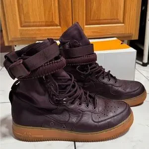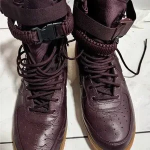 The Nike SF Air Force 1 High Deep Burgundy is a stylish and functional shoe that combines classic design with modern technology. The shoe features a deep burgundy colorway that is both bold and versatile, making it a great addition to any sneaker collection. The upper is made from a combination of leather and ballistic nylon, providing durability and support. The shoe also features a high-top design with a zippered closure for added security and a comfortable fit. The Nike SF Air Force 1 High Deep Burgundy was released on December 15, 2017, and retails for $300.