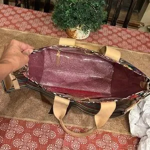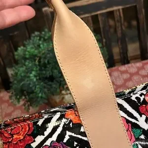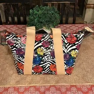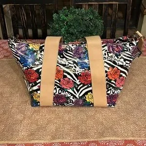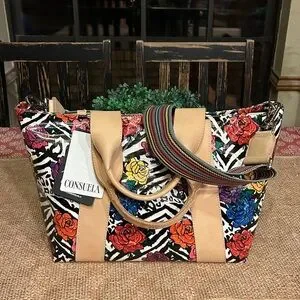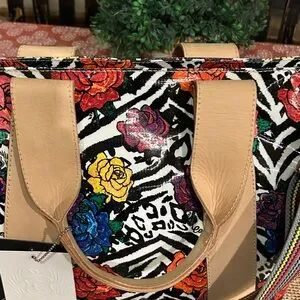 I believe this may be one of a kind, or one of few, in this color/print. NWT but has a few spots on the leather straps; see all photos; last three photos show close-ups of specific spots. I love the concept of this tote, but I have too many Consuela and other totes so downsizing my collection.