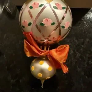 Charming ornament with floral pink accents. Features gold and orange details. Perfect for holiday decor.
