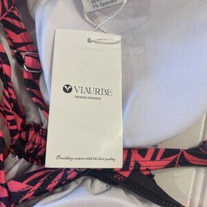 Chic women’s one-piece swimsuit by Viaurbe in a bold black and pink tropical leaf print. Features a ruched front with lace-up detail, stylish cutout at the waist, and adjustable straps for a secure fit. Designed with tummy control for a flattering silhouette. Perfect for pool, beach, resort, or vacation wear. Size Small.