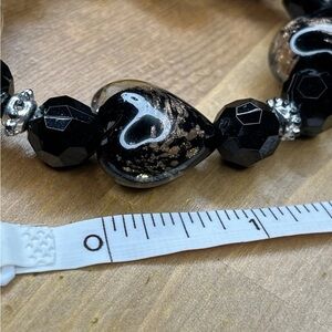 This is a black acrylic bracelet with a heart shape charm. The charm is simulated and the bracelet is stretchable. It is suitable for all occasions. The bracelet is 7 inches in length and has a retro and gothic theme.