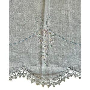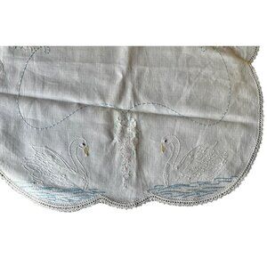 White Linen Table Runner Embroidered Swans Crocheted Edges 41x16 Wedding Dresser