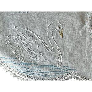 This elegant table runner features exquisite embroidery of swans on fine linen. The intricate crocheted edging adds a touch of vintage charm. Ideal for enhancing dining room aesthetics, it offers a delicate and sophisticated look. Its classic design effortlessly complements various table settings, making it a timeless decorative piece.