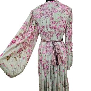 The Hemant and Nandita ADIRA Maxi dress in size L is a stunning floral patterned dress with long balloon sleeves and a round neckline. Made from a shell of 97% viscose and 3% metalized fiber, with a lining of 100% viscose, this dress is perfect for various occasions like travel, weddings, parties, and holy communions. The multicolor dress features embroidered accents, button closure, and a classic theme, making it a versatile and stylish choice for the summer, fall, and spring seasons. Made in India, this dress is a beautiful addition to any woman's wardrobe.